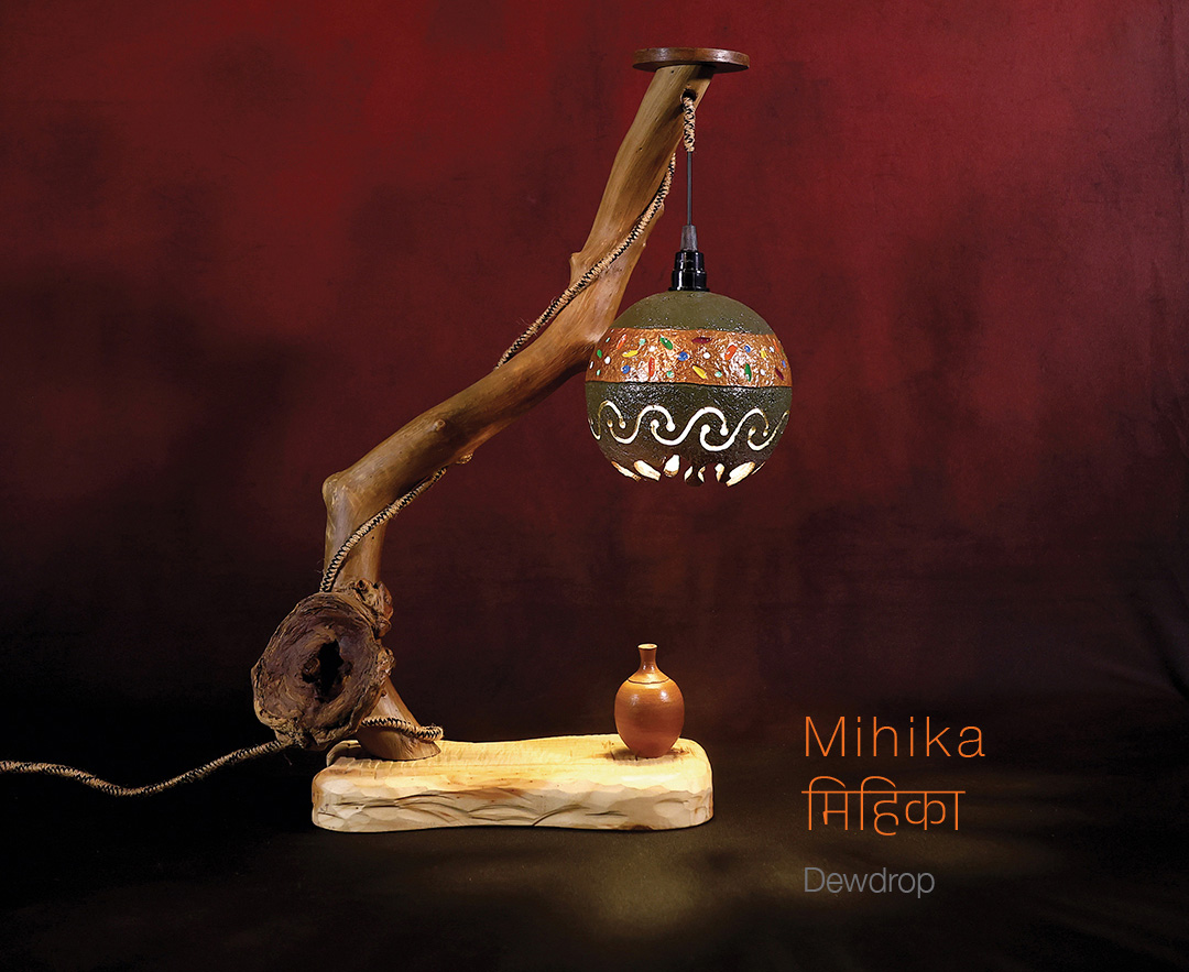 The promise of a new beginning highlighted by the illumination of hope. The power of fusion with multiple eco-friendly materials working together to deliver a deign concept. This assembly has a copper metal cladding with hand painting on the lamp hung on repurposed drift wood and the lamp is made of paper mache.