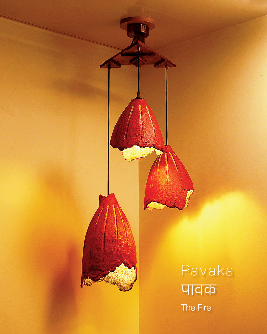 The blessing of fire ushered with a gentle downward light. This paper mâché crafted lamp is shaped with warm, fire-inspired forms. The complementing fire shades creates an uplifting, and vibrant play of light and shadow highlighting our mindful, upcycled design approach.
