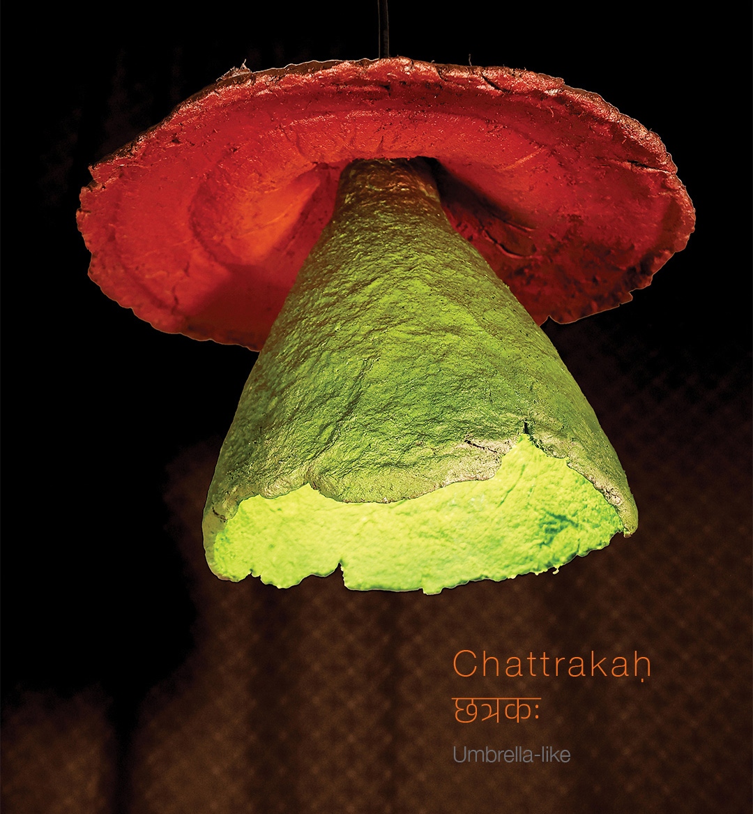 A beam of hope highlighting positivity. The umbrella-like form in bright colours creates a calm downward light projection, offering a soothing ambience while supporting sustainability as the entire structure is crafted from paper mâché.