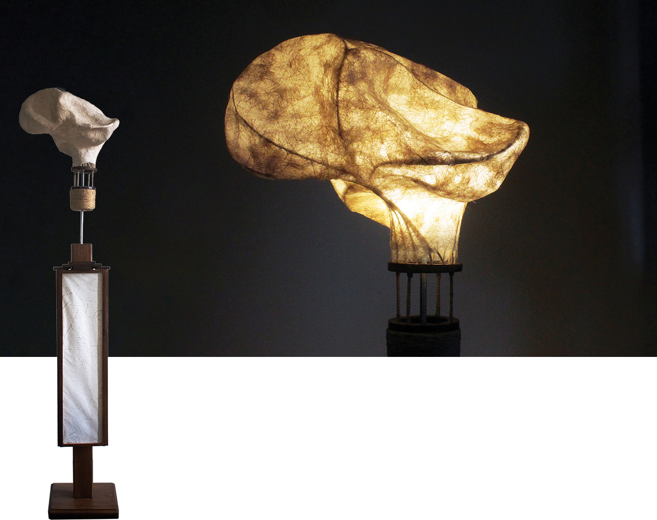 This lamp combines a lightweight reed structure with cotton fabric infused with real flower petals. Crafted from sustainable, nature-derived materials, it creates an uplifting aura and offers a calm, enlightening light experience that brings warmth and positivity to any space.