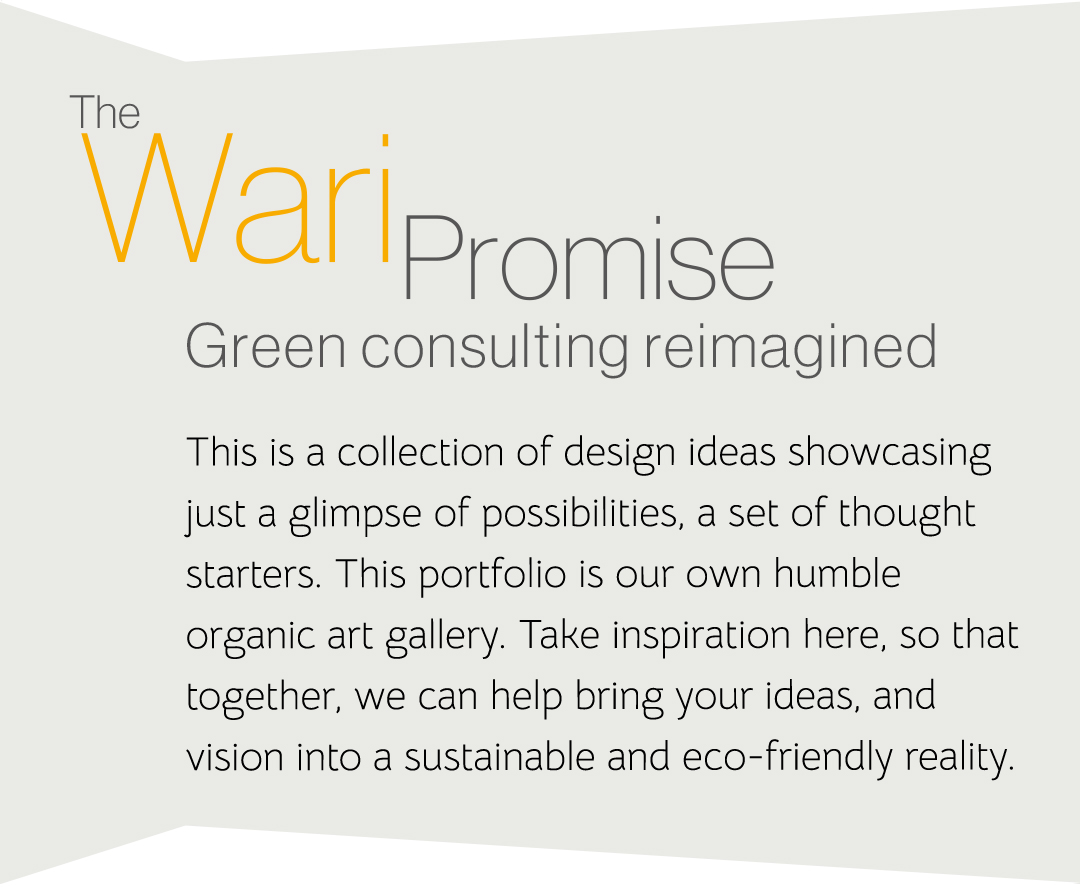 This is a collection of design ideas showcasing just a glimpse of possibilities, a set of thought starters. This portfolio is our own humble organic art gallery. Take inspiration here, so that together, we can help bring your ideas, and vision into a sustainable and eco-friendly reality.